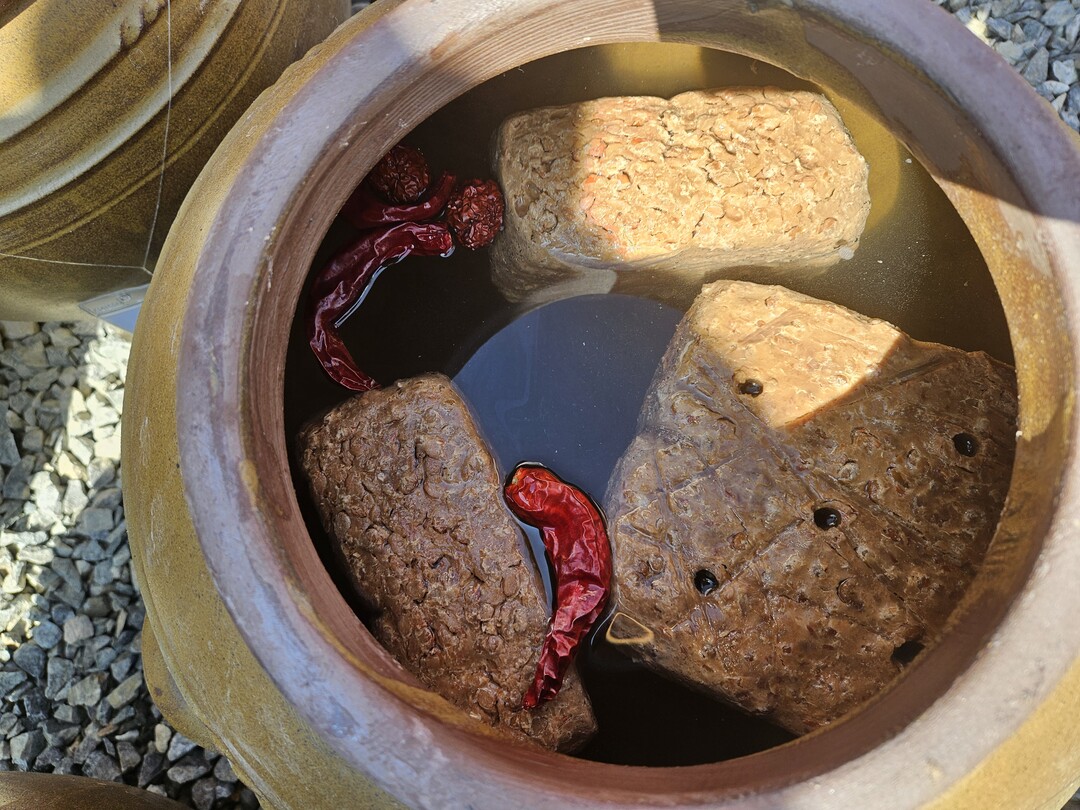 메주와 대추, 고추를 소금물에 담근 모습.
