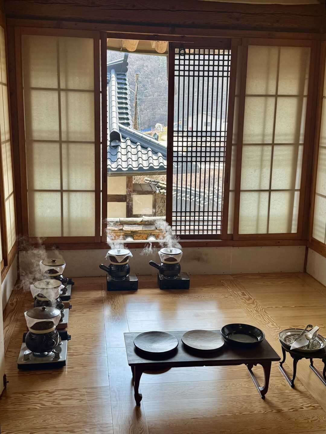 바람에 실려오는 따듯함에 잠시 하늘 멍 한옥 멍 시루 멍도 하다가 드디어 완성된 시루떡과 차를 마시니 조금 전 먹었던 비빔밥을 잊어버린 듯했습니다.